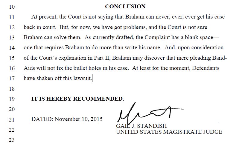 "At present, the Court is not saying that Braham can never, ever, ever get his case back in court. But, for now, we have got problems, and the Court is not sure Braham can solve them. As currently drafted, the Complaint has a blank space - one that requires Braham to do more than write his name. And, upon consideration of the Court's explanation in Part II, Braham may discover that mere pleading Band-Aids will not fix the bullet holes in his case. At least for the moment, Defendants have shaken off this lawsuit."